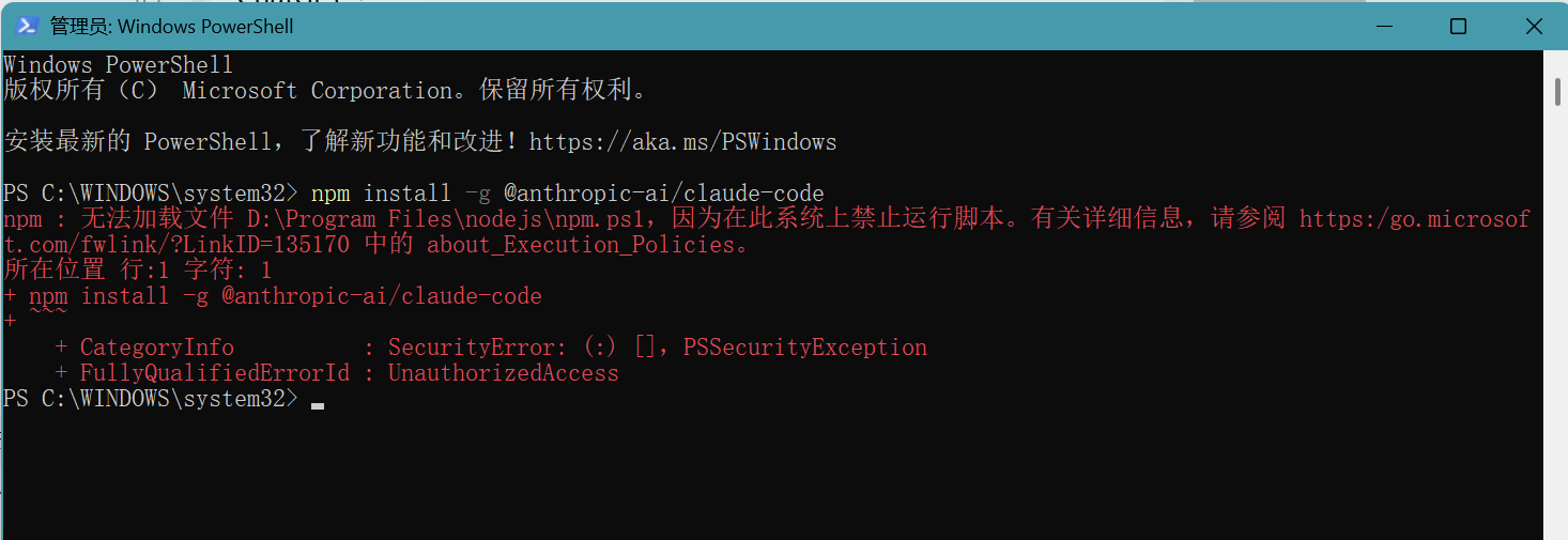 安装claude-code时PowerShell 提示错误:当前的执行策略禁止运行脚本