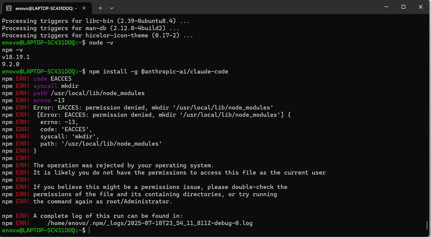 这是 npm 全局安装权限问题,在 WSL 或 Linux 系统中非常常见。